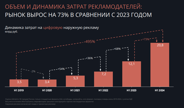 На таблице ниже можно увидеть, с какой скоростью растет рекламный рынок в РФ: об этом свидетельствует увеличение объема денежных затрат рекламодателей на наружную рекламу (источник данных: Admetric).